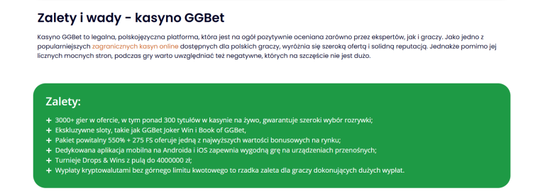„Kasyno GGBet to legalna, polskojęzyczna platforma, która jest na ogół pozytywnie oceniana zarówno przez ekspertów, jak i graczy. Jako jedno z popularniejszych zagranicznych kasyn online dostępnych dla polskich graczy, wyróżnia się szeroką ofertą i solidną reputacją. Jednakże pomimo jej licznych mocnych stron, podczas gry warto uwzględniać też negatywne, których na szczęście nie jest dużo.” – legalnekasynoonline.org